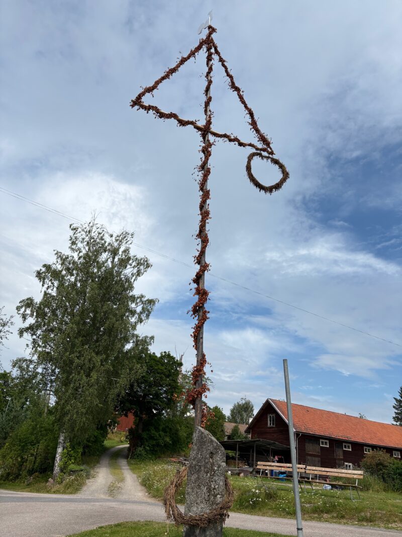 広場には、6月に行われるダーラナ地方最大のイベント「夏至祭」で立てられたメイフラワーポールがまだ残っていました。花はすでにしおれていましたが、夏の始まりの喜びを感じさせてくれる名残の姿。きっと6月には、村の人々が花冠を頭にのせて歌い踊ったことでしょう。その時期に訪れるのもまた素敵だと思います。