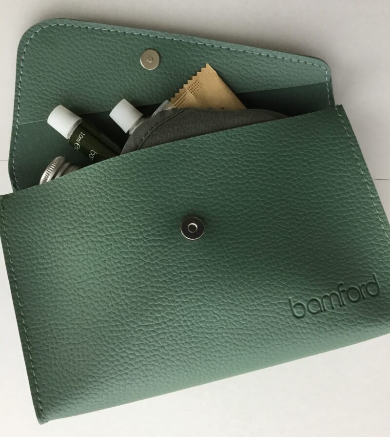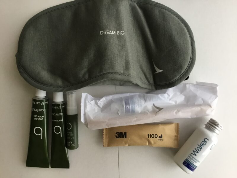 👉 行きと帰りで色違い(オレンジとグリーン)の2セットをいただきました。機内で必要なものがコンパクトに入っていて、うれしい。
