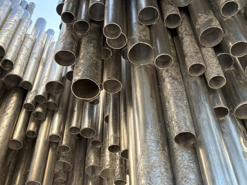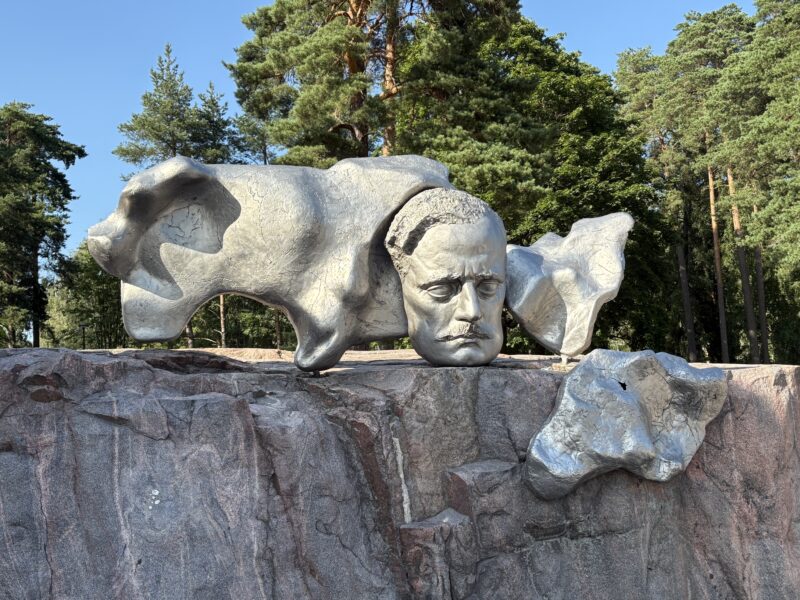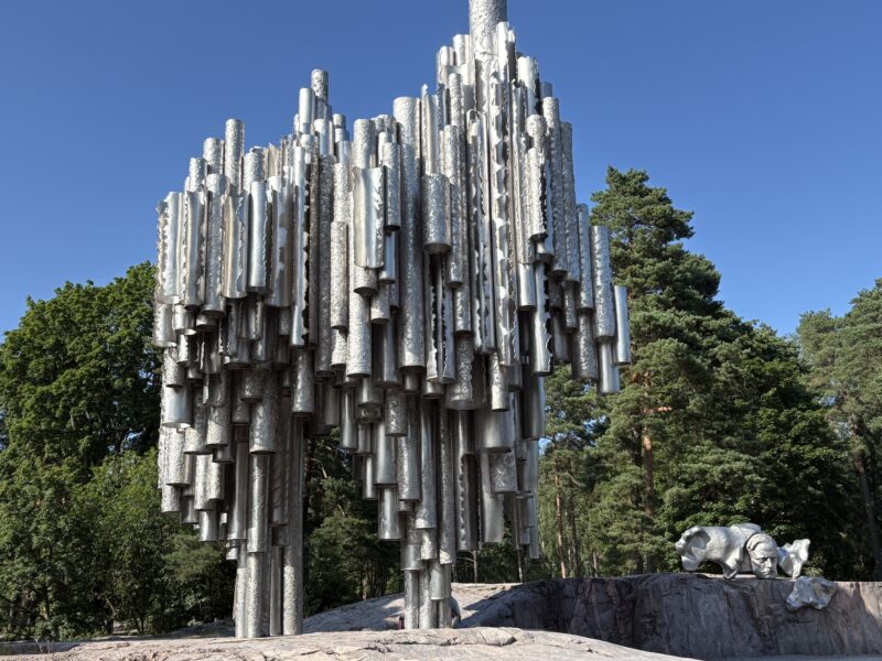 約600本ものステンレススチール製パイプを束ねて構成された抽象的なオブジェは、高さは約8.5メートル、幅は10.5メートルにも及びます。シベリウスの代表作「フィンランディア(Finlandia)」の音の波や北欧の自然を表現したといわれるこの記念碑は、まるで音楽が形をとって空に響いているような独特の存在感を放っています。見る角度によって印象が変わり、岩の上で真下からパイプのオブジェを見上げると、迫力満点!隣にはシベリウスの顔をかたどったブロンズ像も設置されており、記念撮影スポットとして人気です。