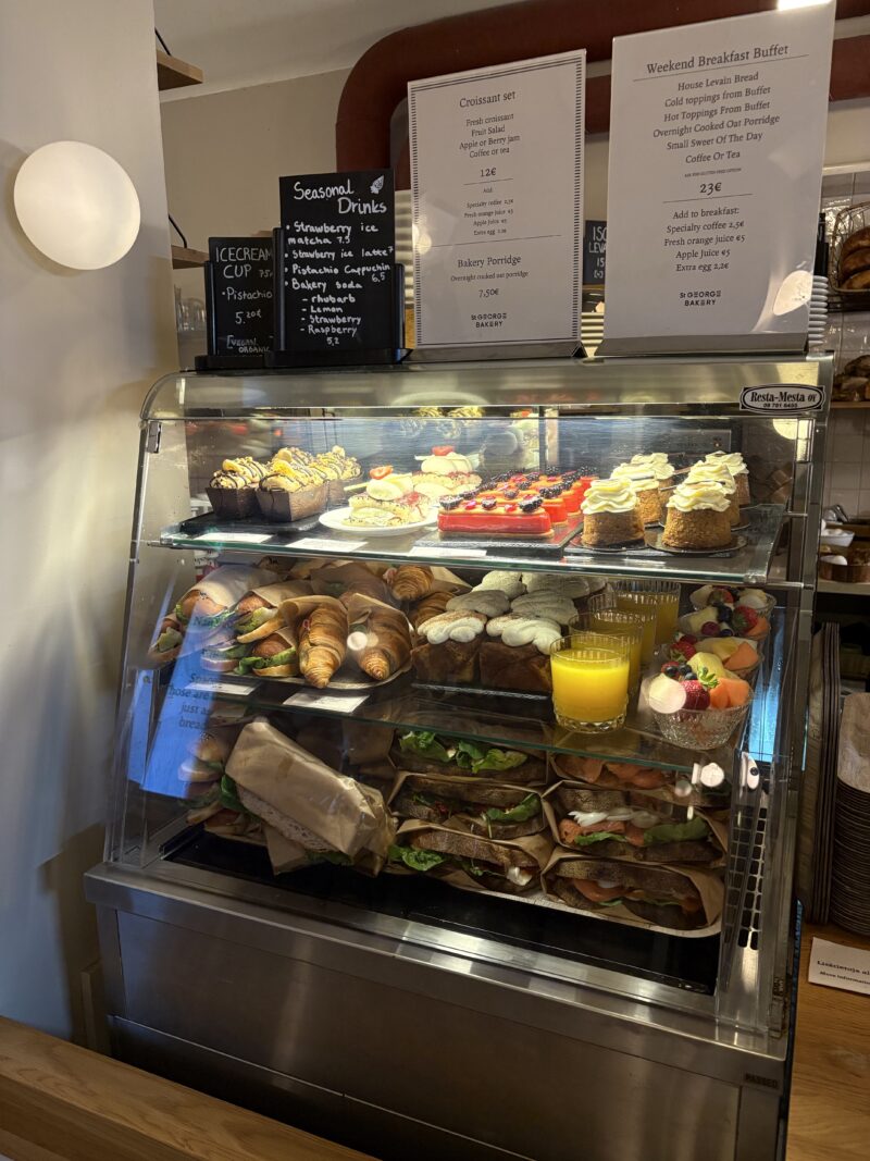 メニュー: 焼き菓子、ペストリー、軽食、コーヒー、アイス、飲み物各種、ビーガン・グルテンフリーあり