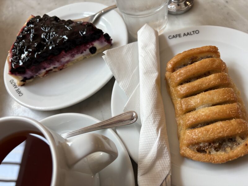 アルヴァ・アアルト設計の名建築の中で過ごすカフェ時間は格別。昨年は満席で諦めたため、今年はオープンと同時に訪れました。天窓からの自然光、見下ろすことができる階下の本屋さん…全てアアルトデザインの洗練された空間です。北欧らしいゆったりした時間が流れます。