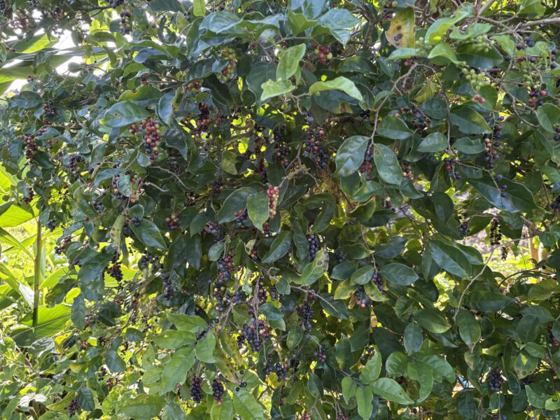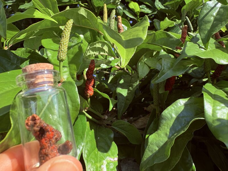 園内には、ピーヤシ(島胡椒)が実った場所が一か所だけありました。あちこちに植えられたものの、なぜかここだけが育ち、冬に収穫を迎えるのだそう。そのピーヤシを実際に収穫させてもらえるという、貴重な体験。「育つ場所を選ぶ」という話が、妙に心に残りました。