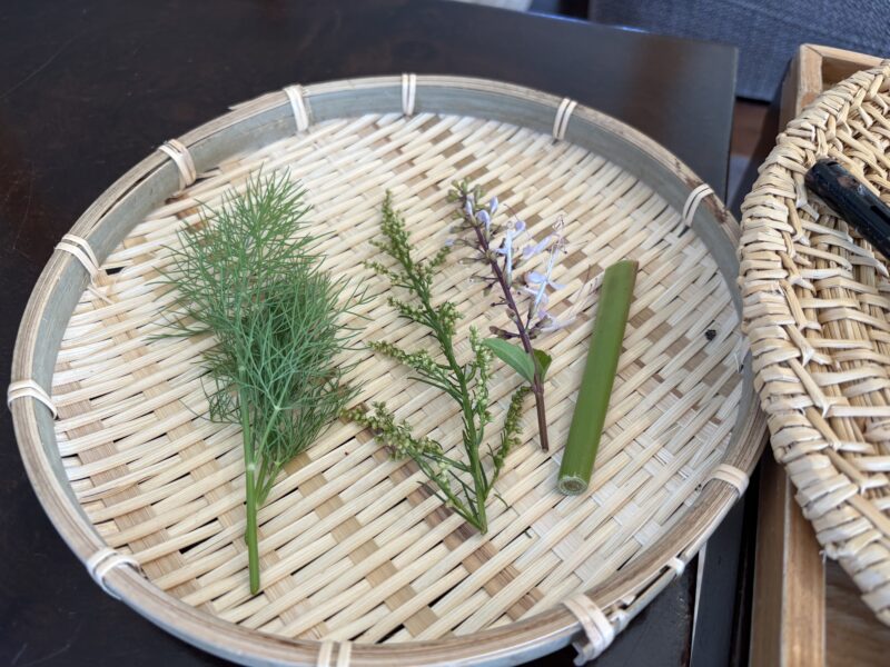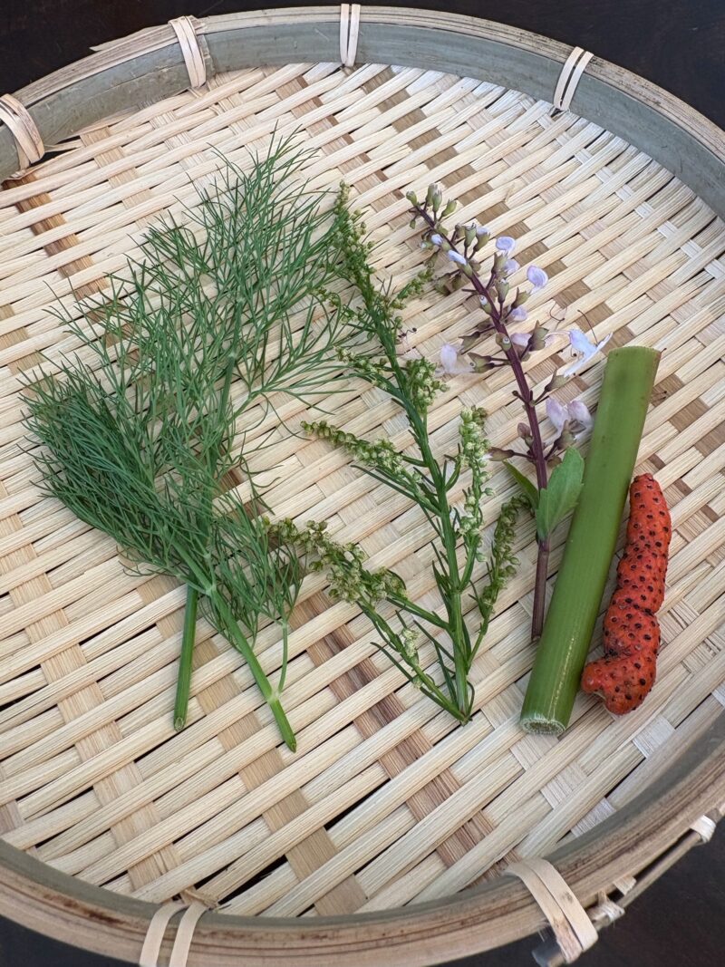 この日収穫したのは、4種類のハーブ(左から、ウイキョウ、ハママーチ、クミスクチン、月桃)。中でも、ウイキョウ(フェンネル)は、とても爽やかでやさしい香り。胃腸を整える作用があるそうで、その時の私にちょうど必要なハーブでした。