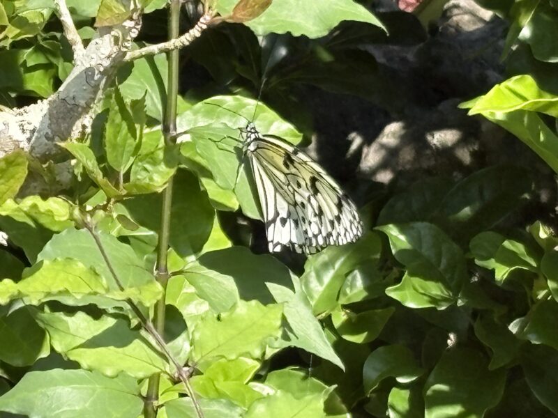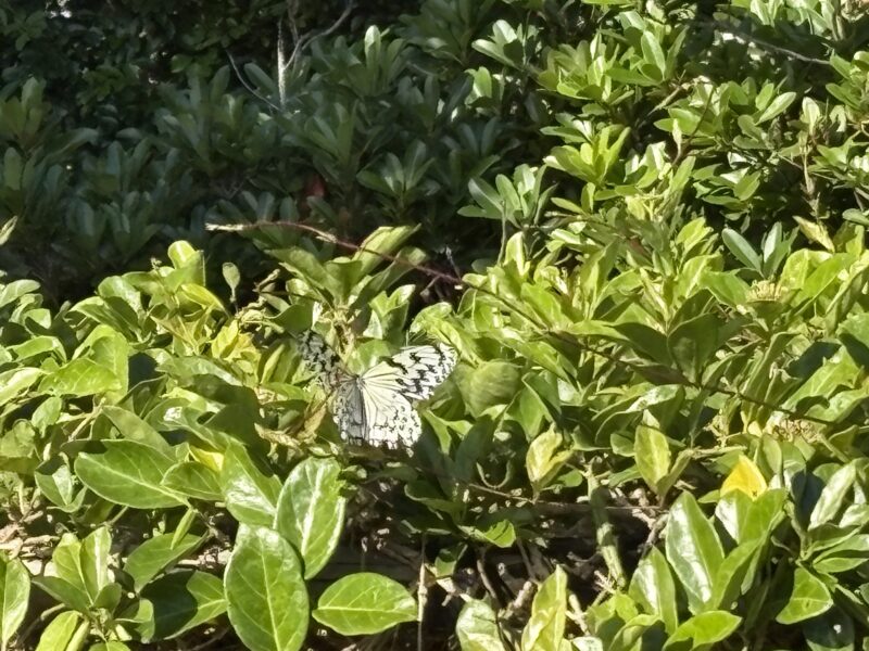 園内では、ハーブ園をはじめあちこちで、さまざまな種類の蝶々がひらひらと舞っていました。冬とはいえ、さすがは竹富島。思わず足を止めて見入ってしまいます。その中で教えてもらったのが、ひときわ大きく、しかも希少だという大胡麻斑(オオゴマダラ)という白い蝶々。この蝶々がここだけに卵を産むという植物ホウライカガミ(キョウチクトウ亜科)が、“この蝶のためだけ”に植えられていました。