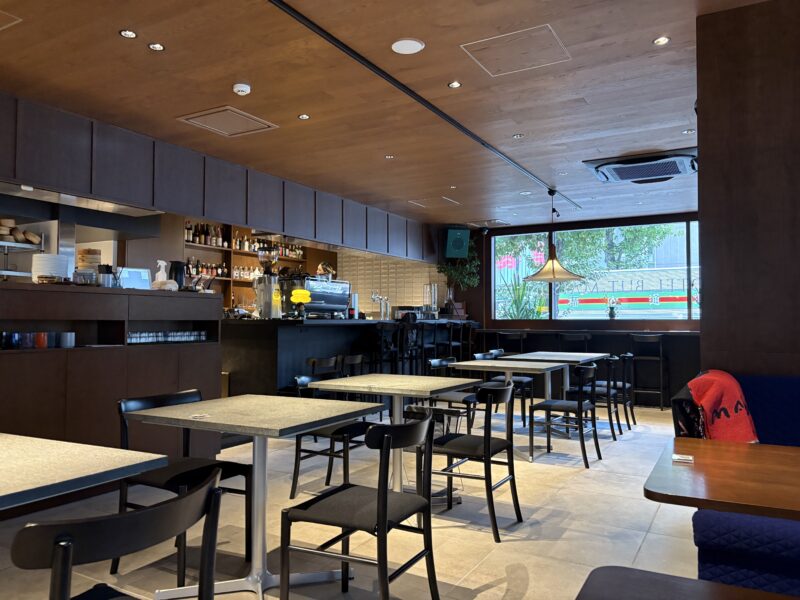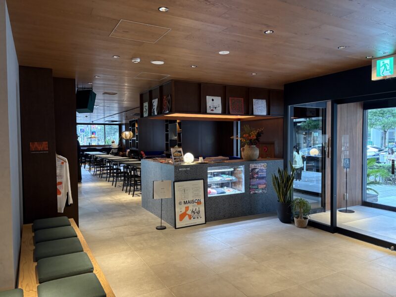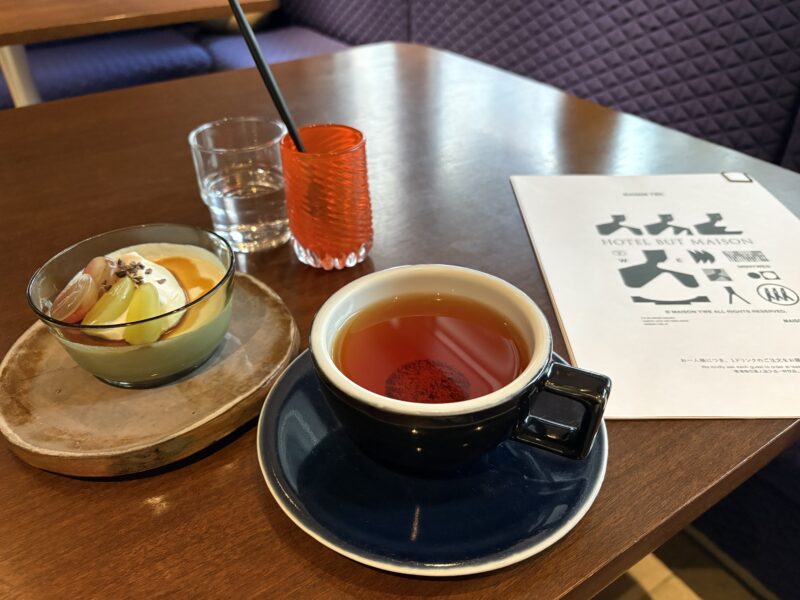入口横にはセンスの良いカフェレストランがあり、朝・昼・夜と食事も提供している様子。少し早めに到着したので、まずはここでカフェタイム。紅茶と一緒に、コーヒー風味のブラマンジェ+フルーツをいただきました。空間もメニューもおしゃれで、朝食やランチも美味しそう。