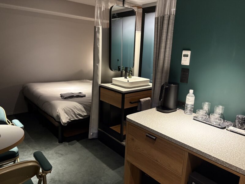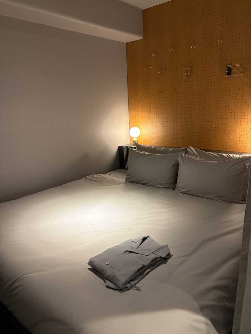 客室はキングサイズベッド1台のお部屋。決して広くはないものの、必要な設備がコンパクトにまとめられ、スタイリッシュで快適。ホテルオリジナルのアメニティもおしゃれ。