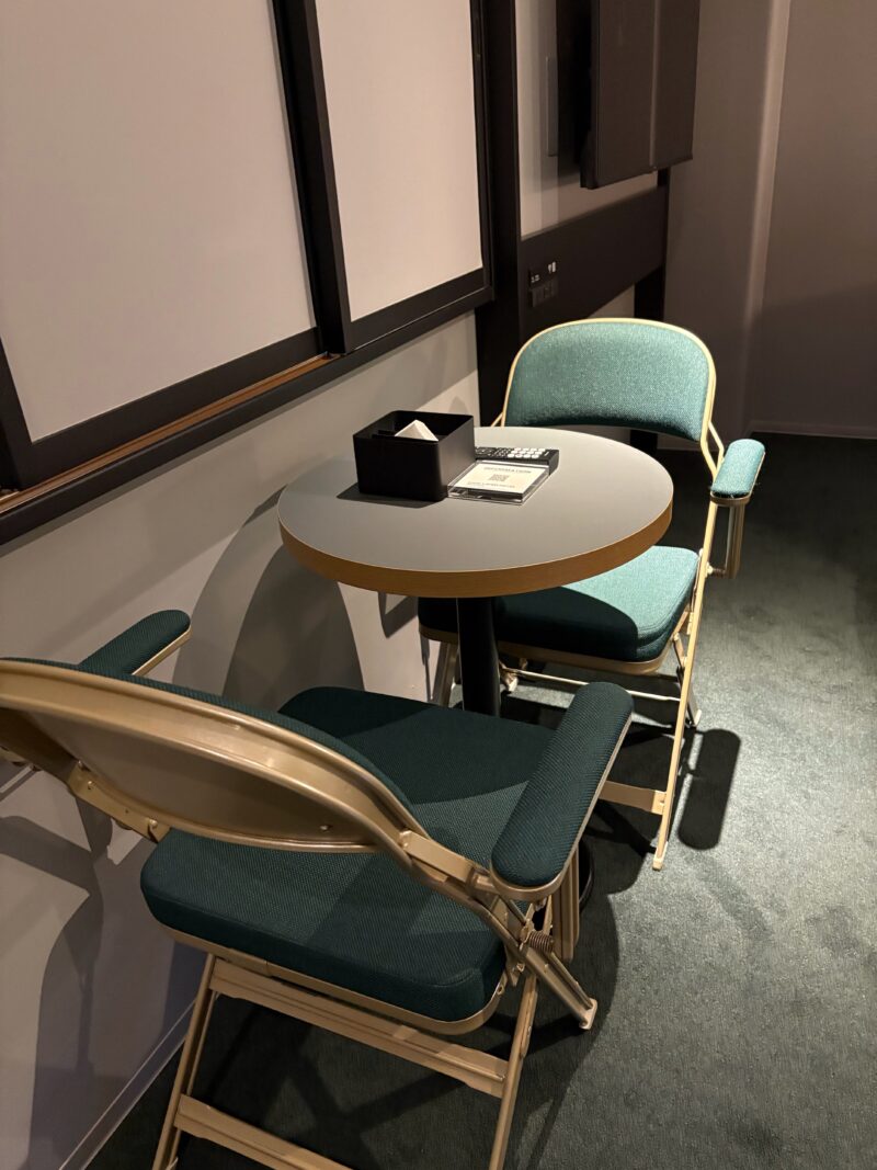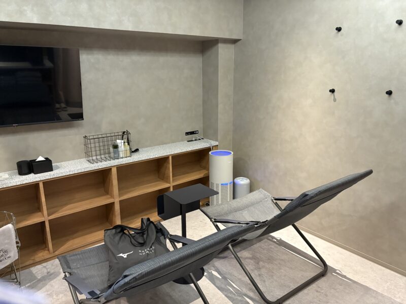 フロントでサウナ用の化粧水などが入ったバスケットと鍵を受け取り、専用サウナルームへ向かいます。中に入ると、1人で使うにはもったいないぐらいのゆったりスペース。2台のリクライニングチェア+予備のチェア、各種アメニティが揃い、飲み放題のお水、トイレ、テレビ、エナジードリンクまで完備。タオルやスリッパも揃っていて、まさにサウナを満喫するための空間、という感じ。テンション上がります⤴⤴。