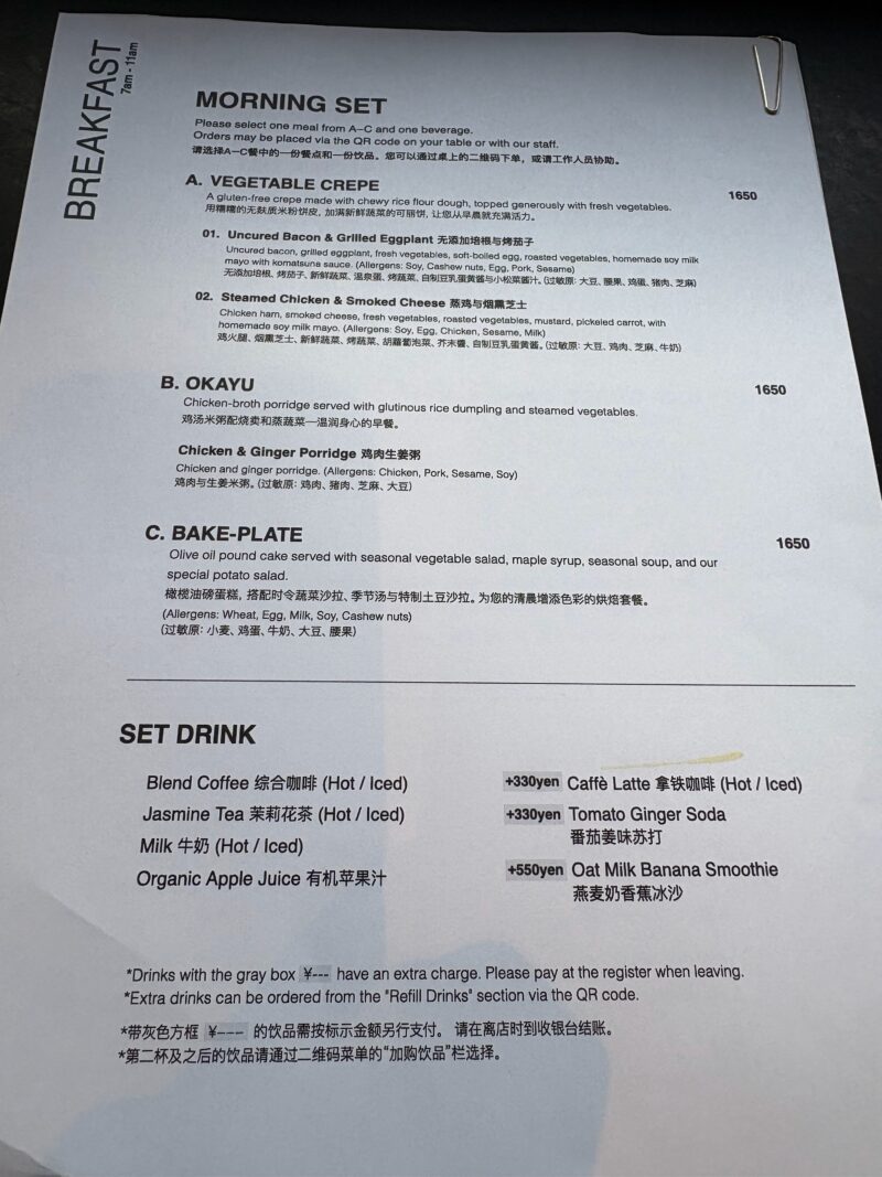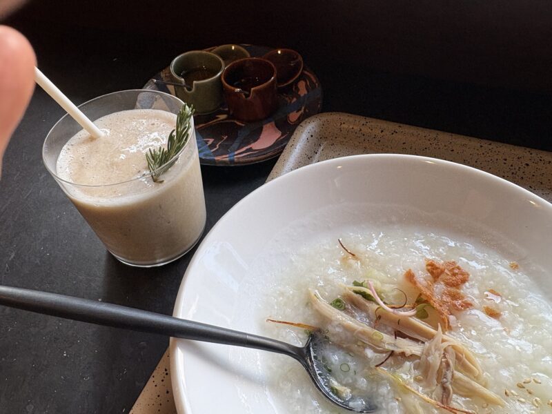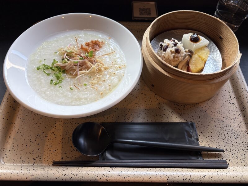 翌朝は1階のカフェで朝食を。3種類のメニューから選べ、私は「鶏の中華粥とミニセイロのセット」をチョイス。ドリンクはバナナとオーツミルクのスムージーにしました。どちらも朝の身体にしみわたる優しい味で、大満足。