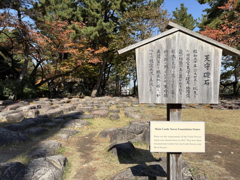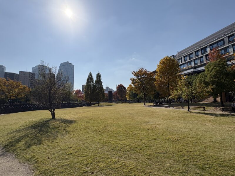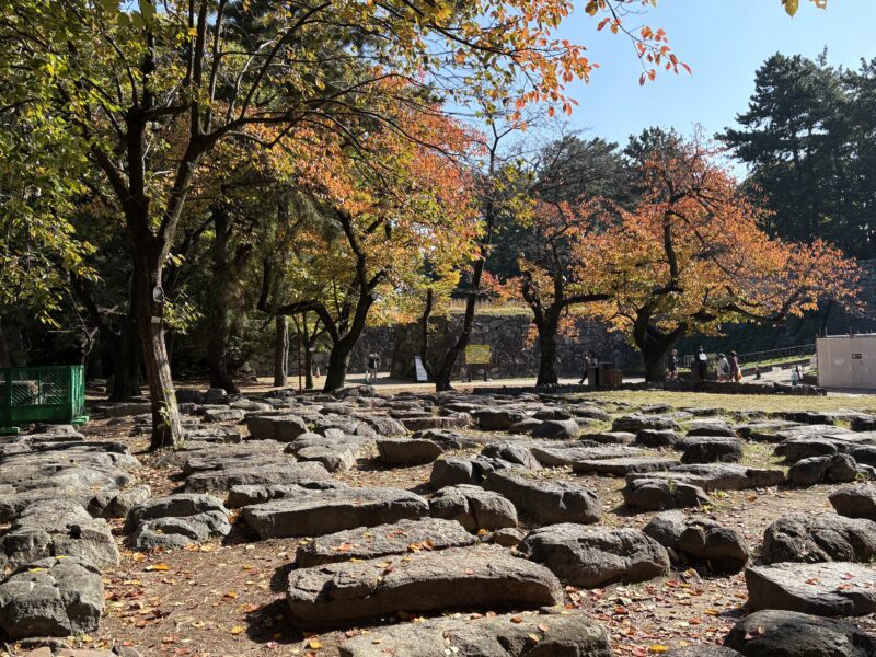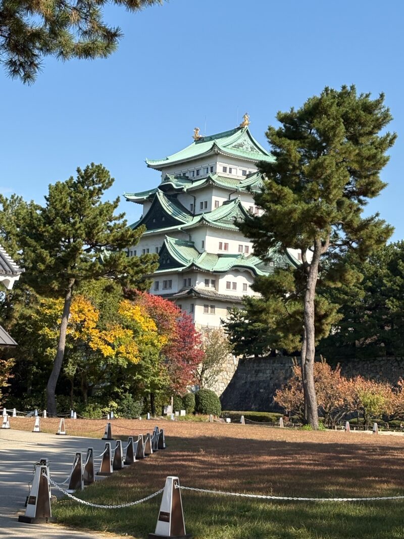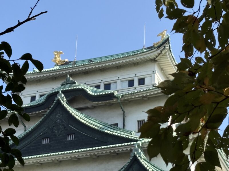 この日は雲ひとつない快晴。青空の下、紅葉が始まった木々と名古屋城のコントラストがとても美しく、天守の金の鯱もキラキラと輝いていました。ちょうど秋の紅葉シーズンで無料公開が行われていて、多くの観光客が訪れていました。観光バスが何台も並び、海外の方もたくさん。