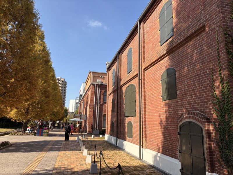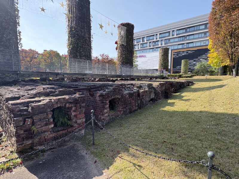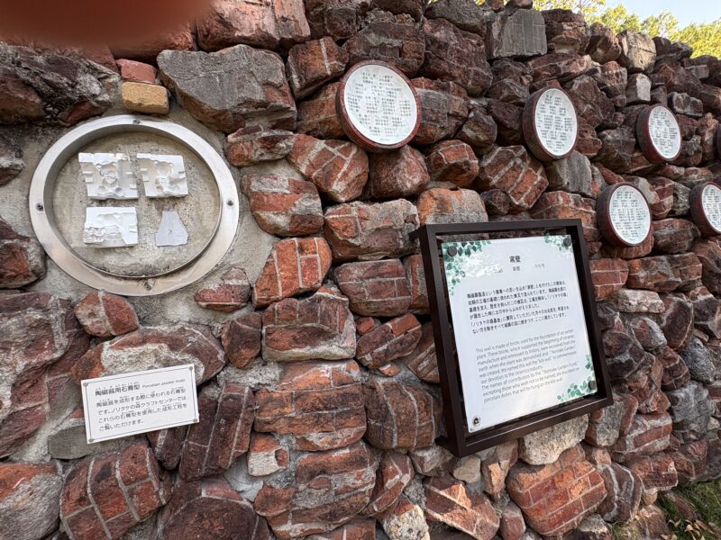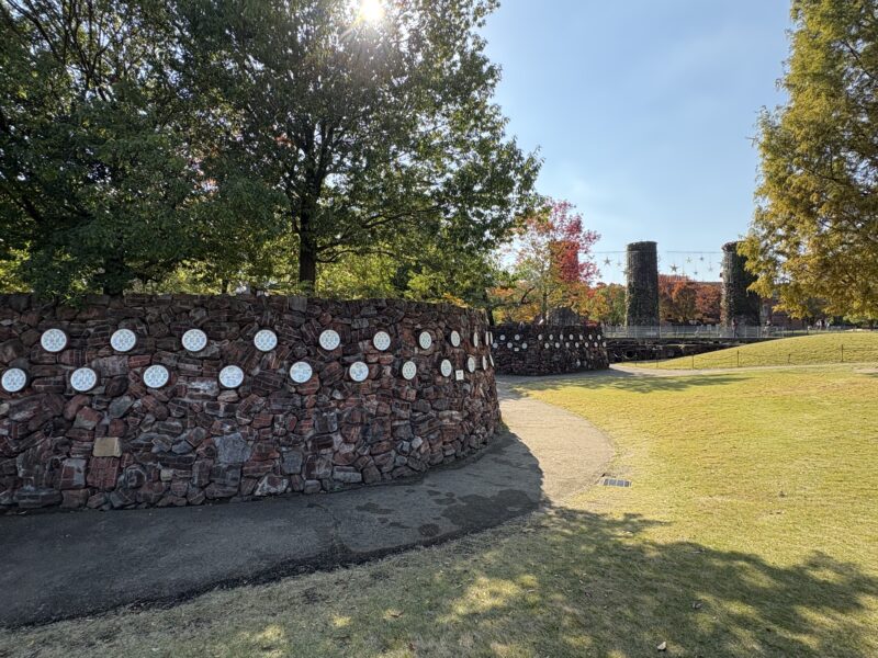 少し奥へ進むと人が少なめの芝生広場や、昔ながらの焼き窯の破片で作られた壁も残っていて、落ち着いた雰囲気が広がります。