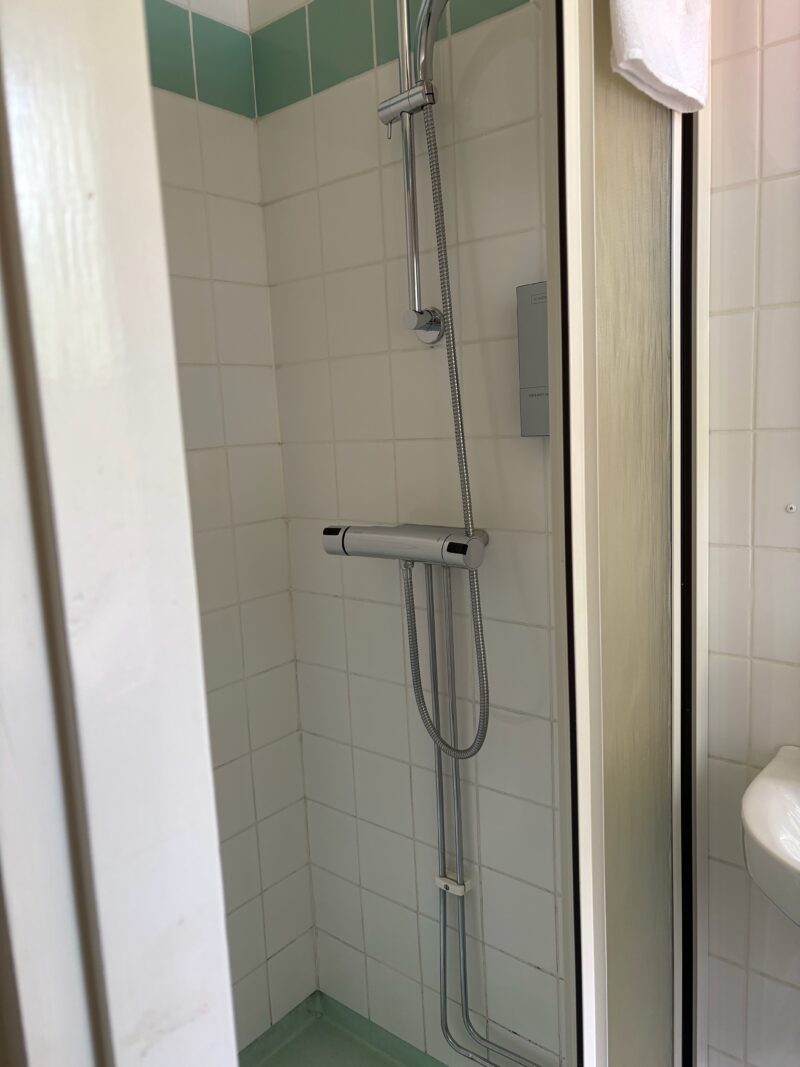 私が泊まったのは「グリーンルーム」。落ち着いたグリーンを基調にしたインテリアで、窓の外には湖と緑が広がり、風が気持ちよく入ってきます。アンティークの椅子や机など、ひとつひとつの調度品にセンスを感じます。ベッドやタオルは真っ白で清潔感たっぷり。バスルームはコンパクトながら、シャワーの水圧・お湯の温度も快適。ガラスの引き戸があって、トイレスペースが水浸しになりません。