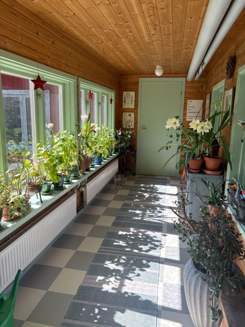 1階には大きなリビングルームがあり、ピアノや絵画、調度品が飾られていて、まるで小さなアートホールのよう。明るい日差しが入るサンルーム風のガラス張り廊下には植物が並び、その先の広いホールでは村の集まりも開かれるそうです。