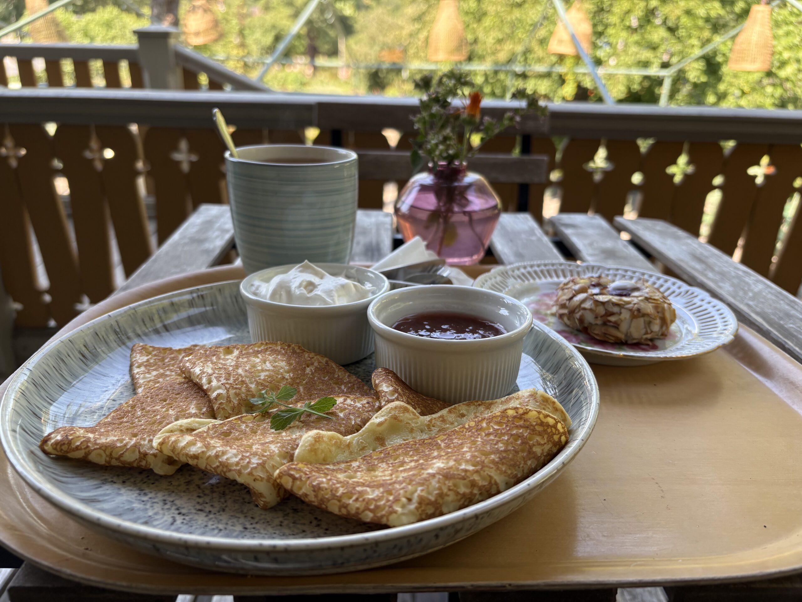 歴史ある建物とアンティークな室内、手入れの行き届いた美しい緑と花あふれる庭、水辺の景色。すべてが絵になるような癒しのカフェでした。パンケーキは甘さ控えめで、添えられたルバーブジャムやクリームも手作りの味で大満足。地元の方々との会話も弾み、滞在中いちばん心に残るカフェ時間となりました。