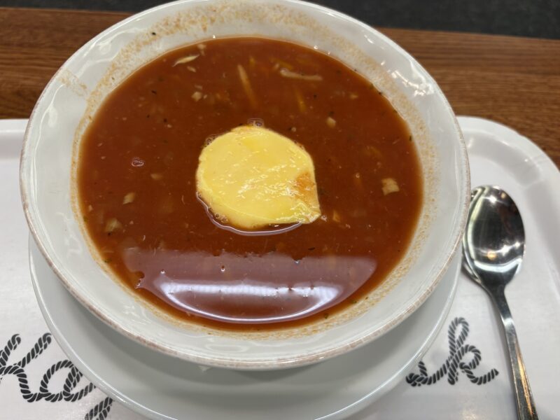 セルフサービスのパン2種類があり、スープとの相性抜群。白身魚やエビ、貝、人参、玉ねぎなど具沢山で、スープの旨味がしっかり。地元の人に愛されるのも納得の味でした。