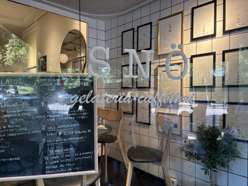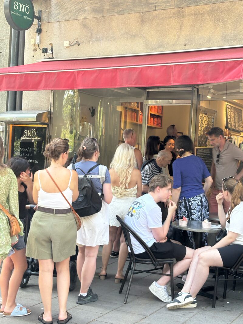 ストックホルムでNo.1ジェラート店と評判の「Sno(スヌー)」。ここは、スウェーデンの“アイスクリーム選手権”で優勝したこともある実力派のお店。ジェラートにうるさいスウェーデンで選ばれたNo.1? ジェラート大好きな私としては食べてみないわけにはいきません!ぜひ行かなくちゃと事前にチェックを入れていました。当日もこの店に行くためだけにわざわざバスを乗り継いで行ってきました。夕方17時ごろ到着すると、お店の前には長い行列が!