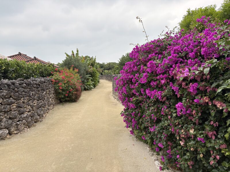 竹富島の中心部に広がる仲筋集落から西集落にかけてのエリアは、赤瓦の屋根、白砂の道、石垣に囲まれた家々が続く、島の原風景ともいえる場所です。