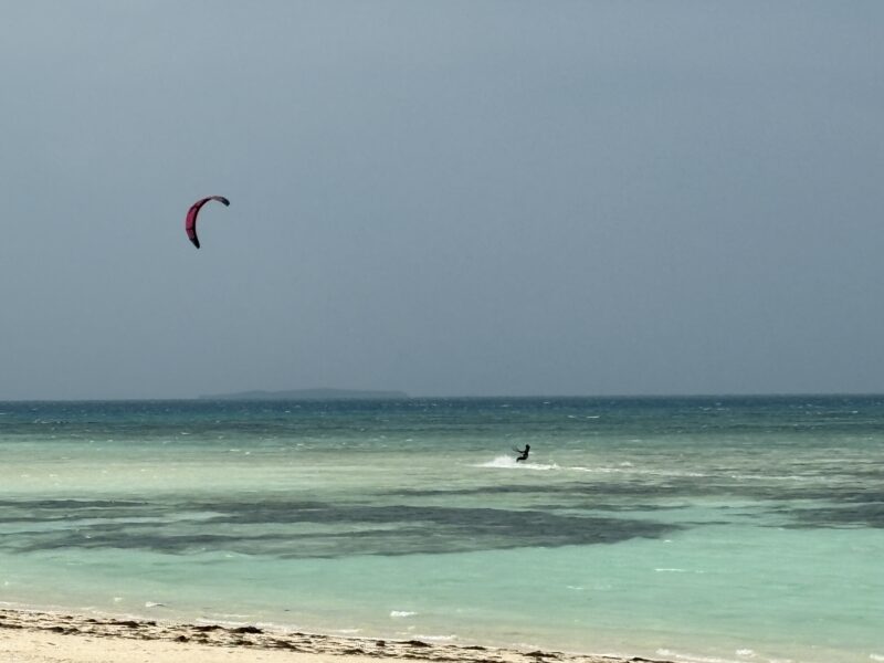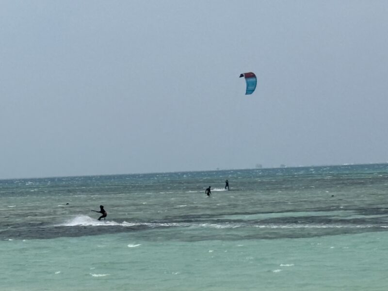 海辺に自転車を停めて景色を眺めていると、空に大きく舞い上がるパラセーリングをしている人たちが。強風の中、勢いよくジャンプする姿は迫力満点!初めて見る光景に、しばらく座り込んで見入ってしまいました。