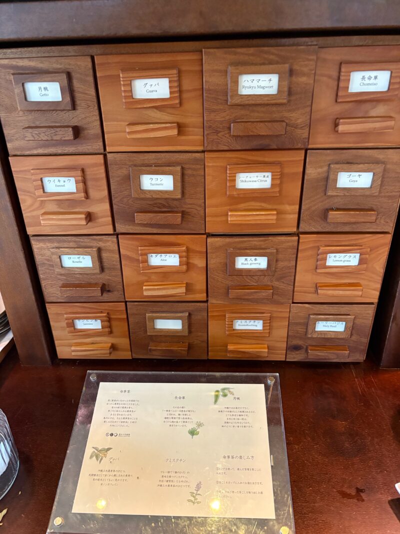 飲み物は、さんぴん茶、コーヒー、紅茶のほか、グアバジュースとシークヮーサージュースが日替わりで。特によかったのが、自由にブレンドできるお茶。自分好みの種類の茶葉の配合を見つけて、何度も楽しみました。香りと滋味あふれる味に、心まで癒されます。