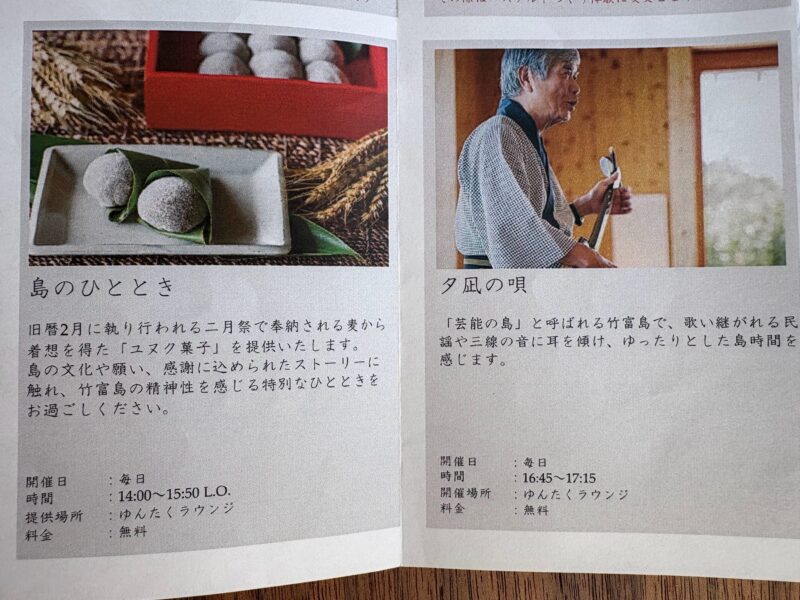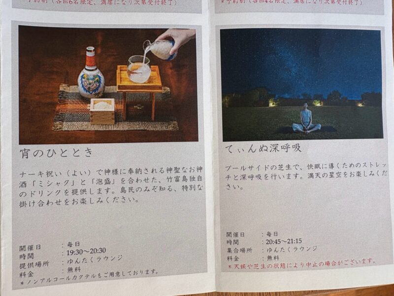 星のや竹富島では、滞在中に参加できる無料のサービスやイベントが、毎日のように用意されています。参加しても、しなくても、利用しても、しなくても自由。この自由さ加減がいい感じ。でもせっかくの離島ステイ、時には上手に活用して「何もしない贅沢」を、より深く味わいたい。