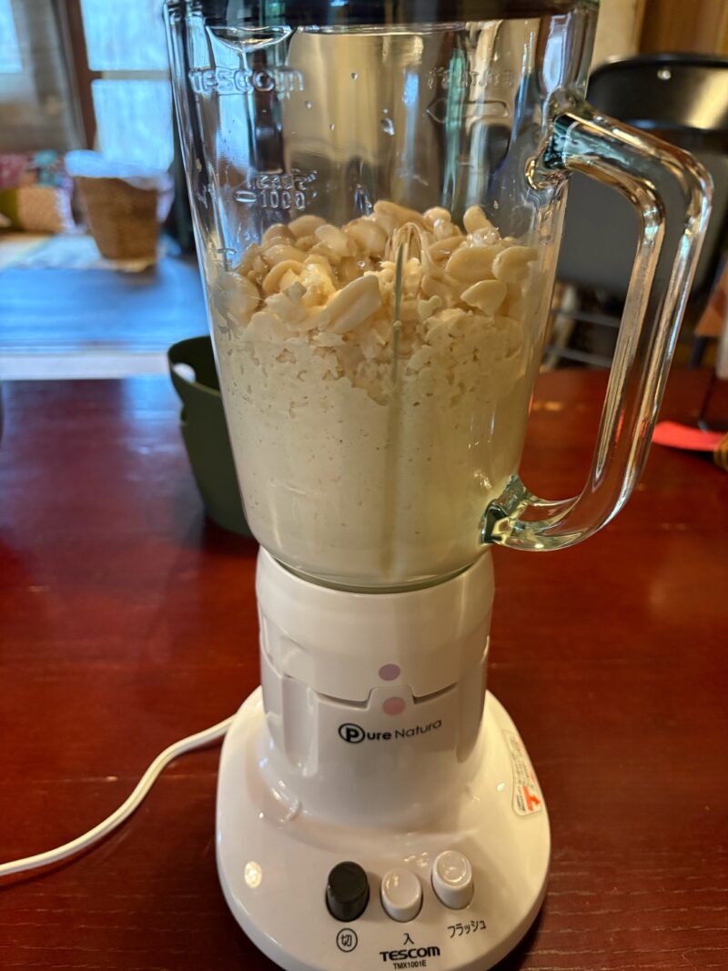 まずは、茹で上げたピーナッツをミキサーにかけ、それを布でぎゅっと絞る工程。