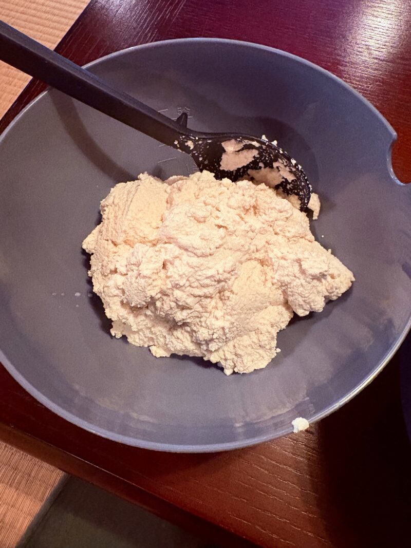 さらに、お鍋で練る工程では、焦げ付かないように絶えずへらを動かし続けなければならず、こちらもなかなかの力仕事。気づけば汗だく。こんなに力がいる工程だったとは。タレも市販品ではなく、自分で手作り♪ なんとかすべての工程を終え、お豆腐とタレは急速冷蔵庫へ。