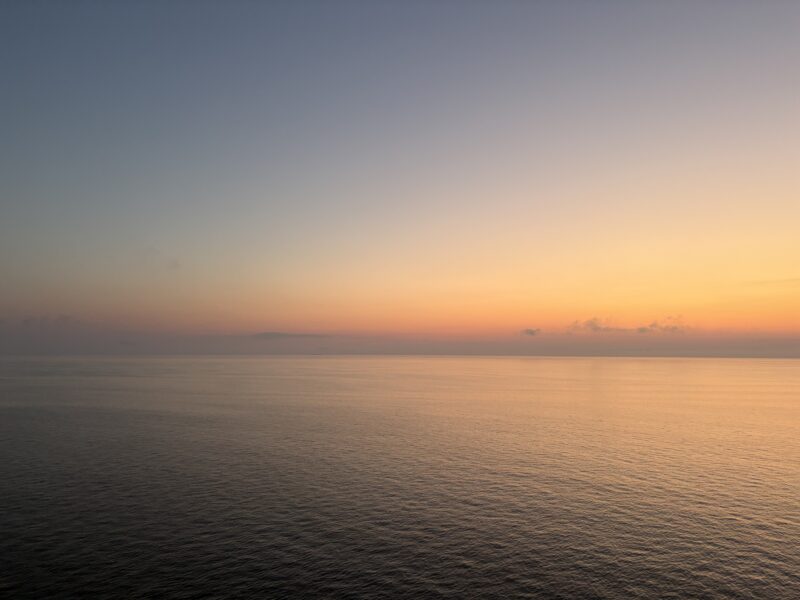 いつも通り早朝に目が覚めたので、一番上のオープンデッキへ。まだほとんど人がいなくて、冷たい風が頬に心地よい。やがて空が明るくなり始め、バルト海の夜明けがゆっくりと姿を現しました。静かな海と薄いオレンジ色に染まる空――心に残る風景でした。