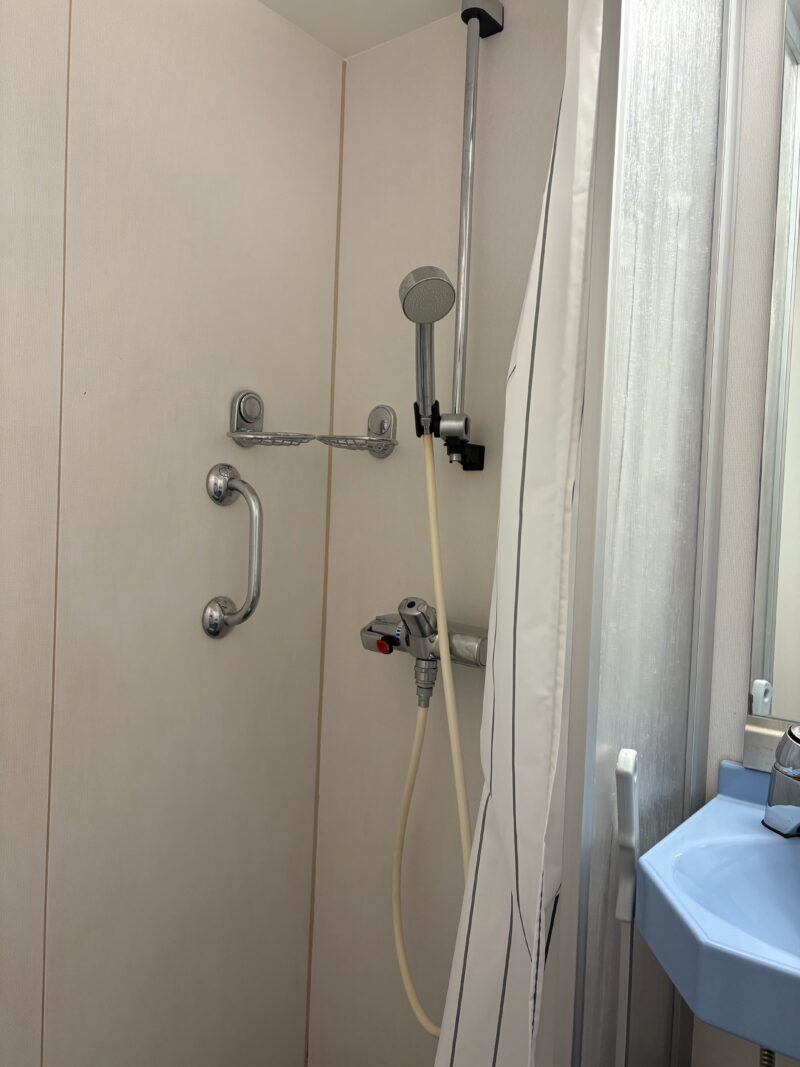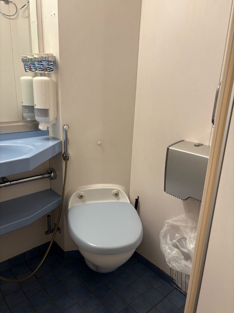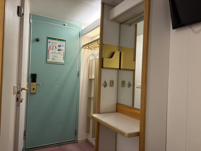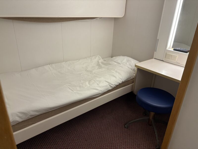 ヴァイキングラインには、いろんなタイプの部屋があり、もちろん費用も船室も上から下まで。今回の客室は5階。いろいろ事情があり(上記埋め込みブログ記事参照)、予約していた部屋とは違いましたが、結果的に一人部屋が取れたので一安心。窓なしのシンプルな部屋で、コンパクトながら必要なものはすべてそろっていました。2段ベッドにもなる仕様で上の段は折りたたみ式。もちろん下のベッドのみ使用。小さな机とチェア、ハンガー、バストイレ付き(シャワーのみ)。シャワーはハンディタイプで、カーテンで仕切るスタイルです。
